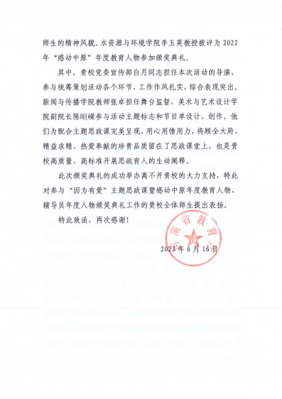 本网讯(通讯员 黄玉蕊)近日,新葡萄官网收到河南省教育厅的感谢信,对新葡萄官网参与承办的“因为有爱”主题思政课暨感动中原年度教育人物、辅导员年度人物颁奖典礼所作出的贡献予以高度评价,并表示肯定和感谢。