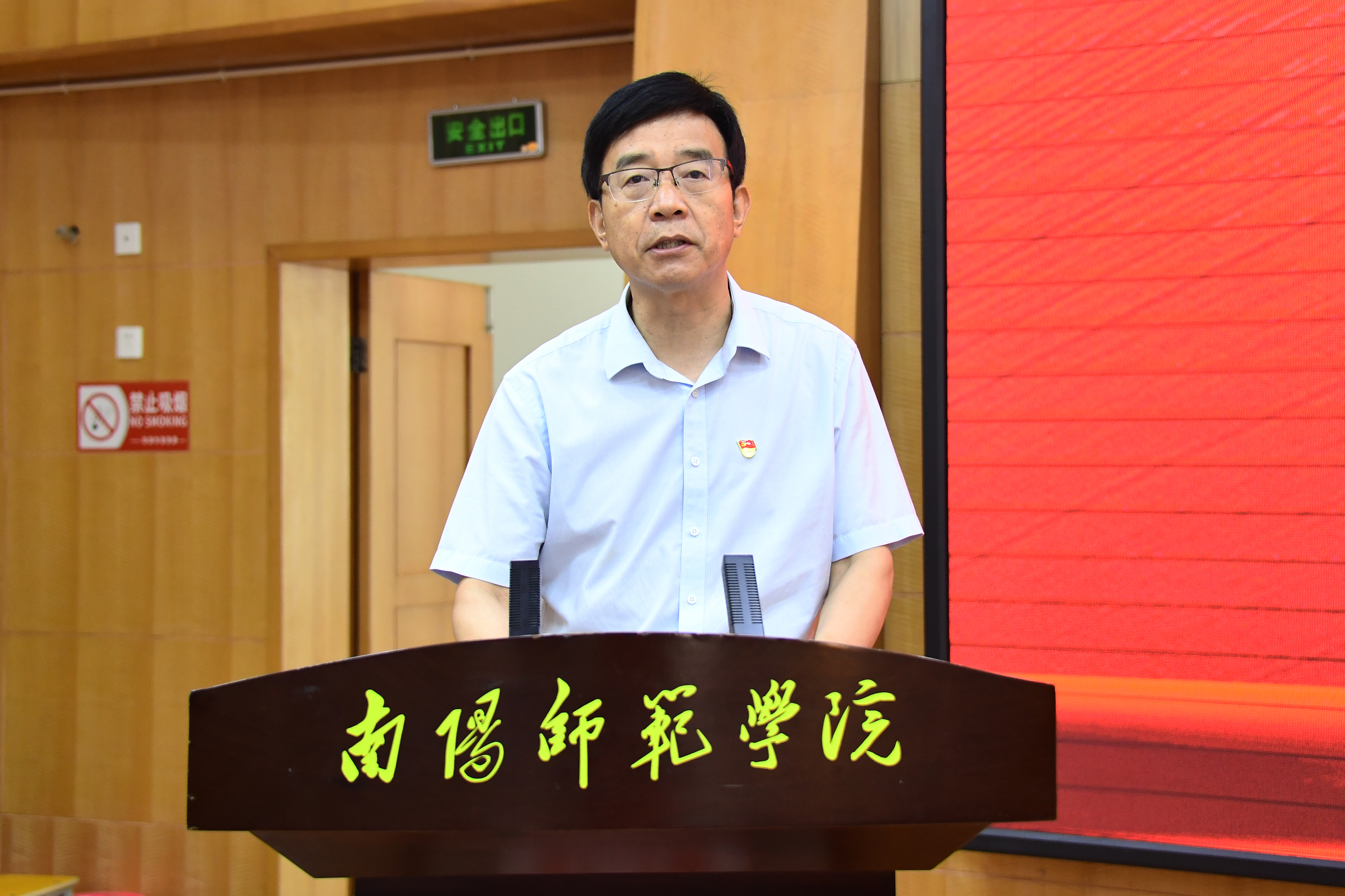 2校党委书记卢志文、人民银行郑州中心支行反洗钱处处长张戈、南阳市人民检察院副检察长潘玉亭、南阳市公安局副局长张志刚共同为“河南省反洗钱宣传教育基地(试点)”揭牌