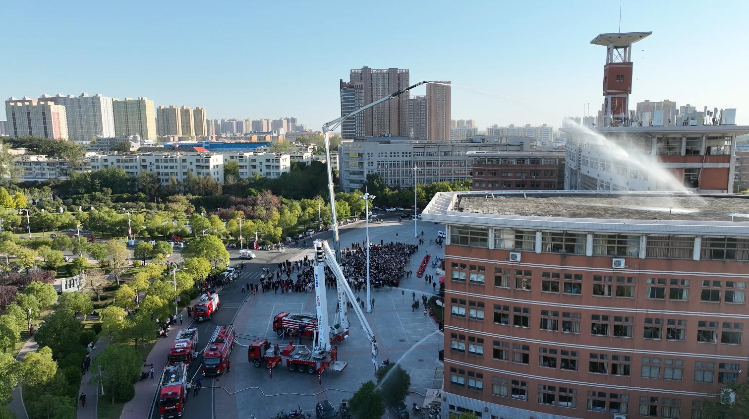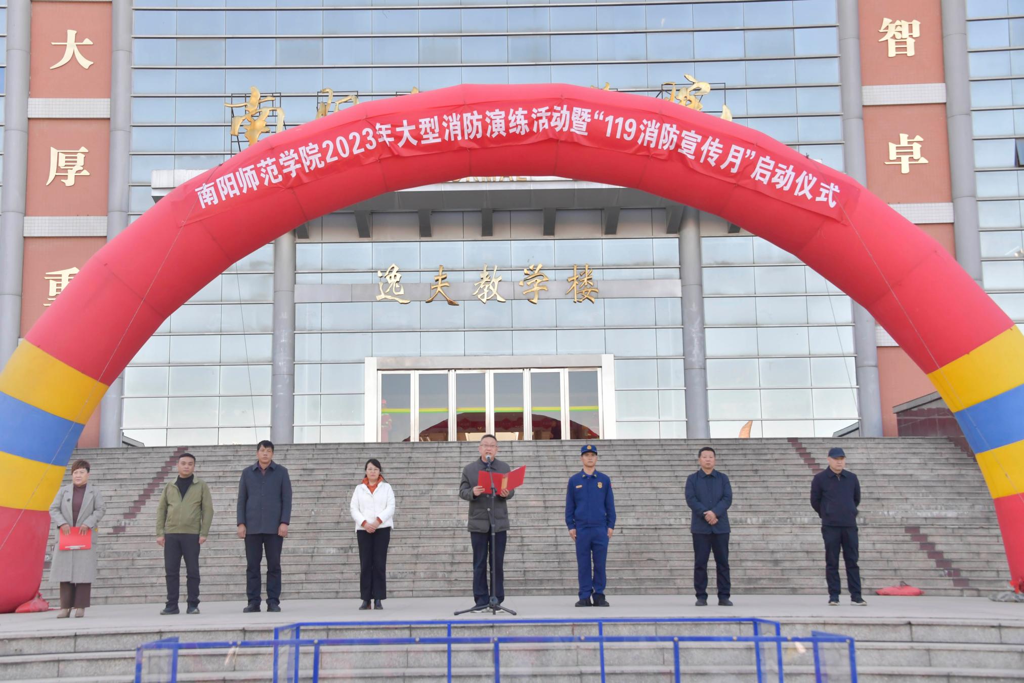 本网讯(王大春/文 王嘉豪 樊梦泽/图)11月17日下午15时,新葡萄8883官网AMG2023年大型消防演练活动暨“119”消防宣传月启动仪式在逸夫楼东广场举行。副校长周旗,市消防队特勤站站长周晓东、校防火委主要成员单位负责人、机关各单位、各学院安全工作负责人、消防安全重点单位、重点部位、重点岗位责任人、学生代表及部分消防官兵参加活动。