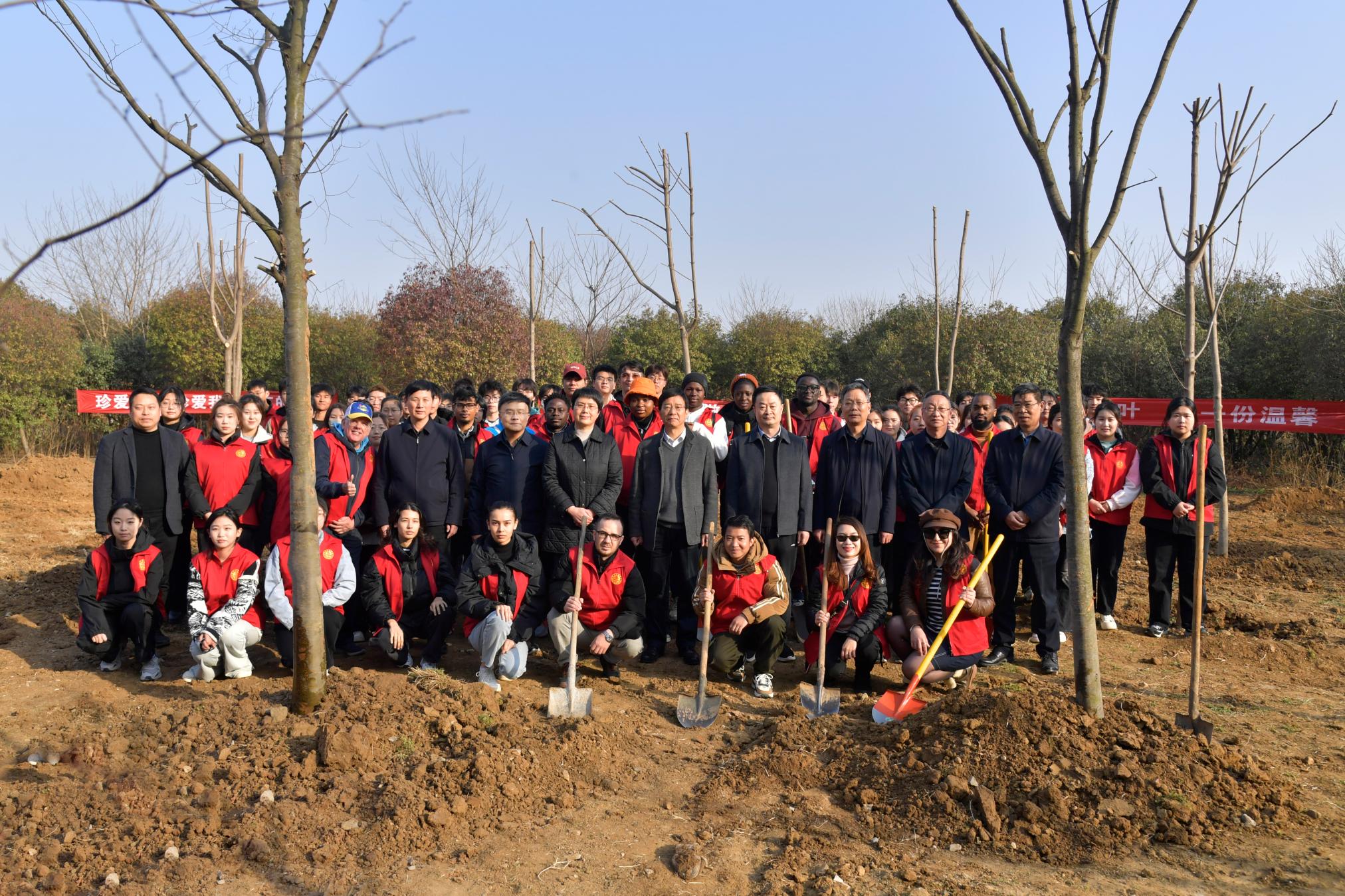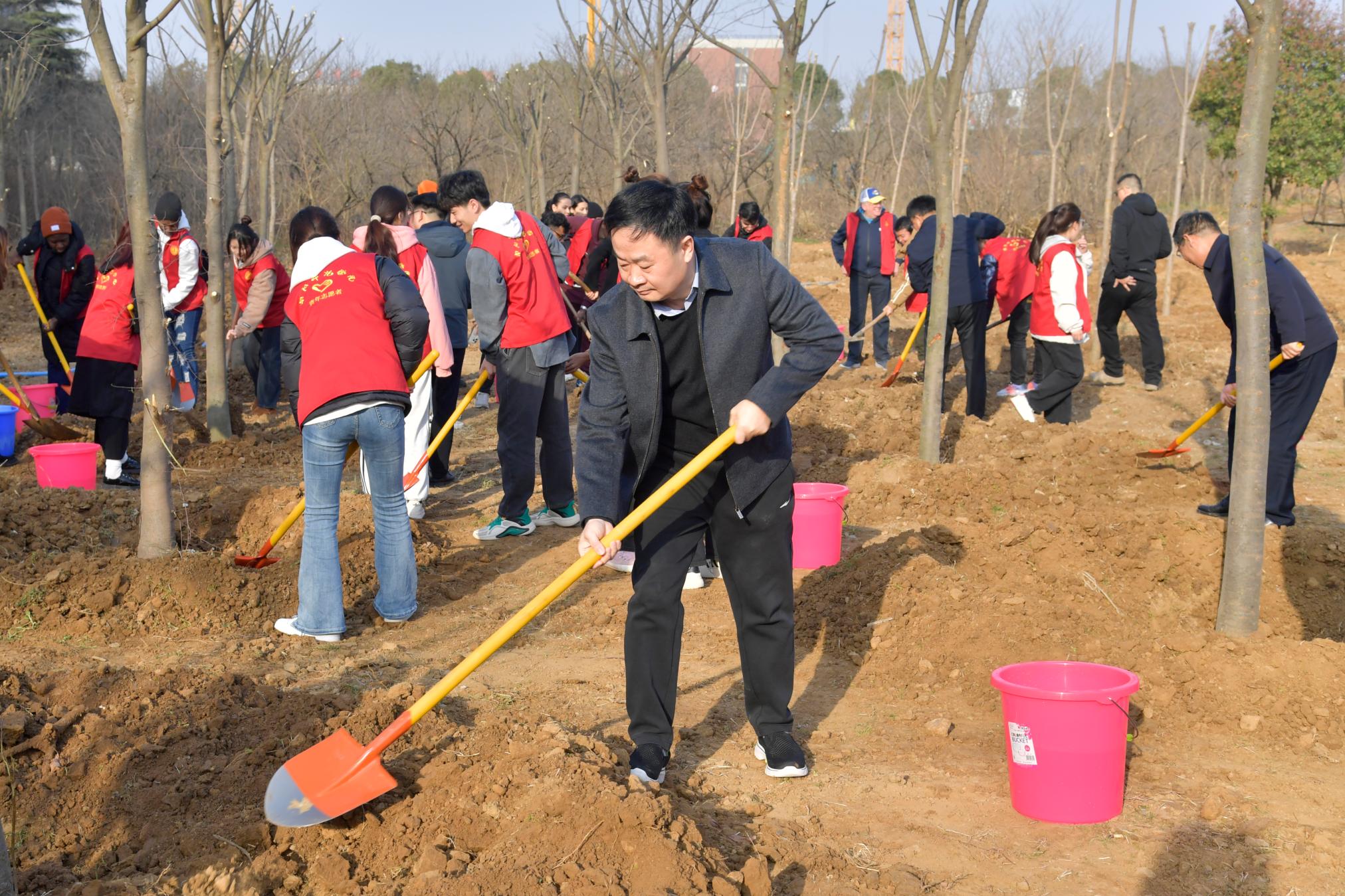 本网讯(周鹏/文 王嘉豪 樊梦泽/图)春回大地花千树,万物勃发绿盎然。3月12日上午,校领导张宝锋、罗永松、孟静雅、刘守勇、周旗、朱其春、刘红林、熊新忠等带领机关单位负责同志代表、留学生志愿者代表、学生志愿者代表200余人,来到张衡教学楼北侧,参加植树活动,为校园增添新绿。