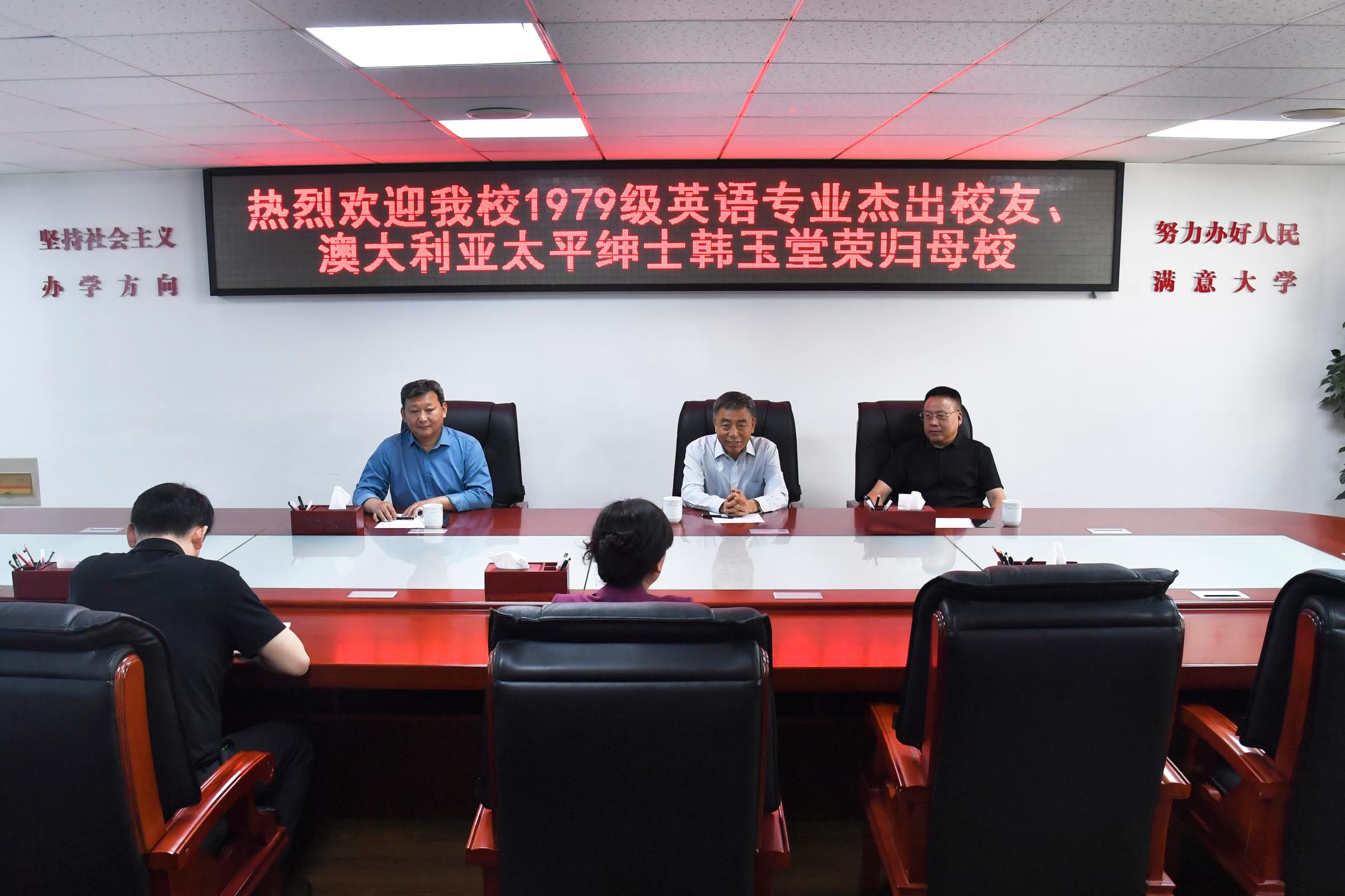 本网讯(李剑楠/文 周荣/图)4月25日上午,新葡萄官网1979级英语专业杰出校友、澳大利亚太平绅士韩玉堂,信阳师范大学张震教授,桐柏县县政府王金绪等校友一行荣归母校。座谈会在办公大楼三楼西会议室举行。副校长王岩出席。校友工作办公室相关同志参加。