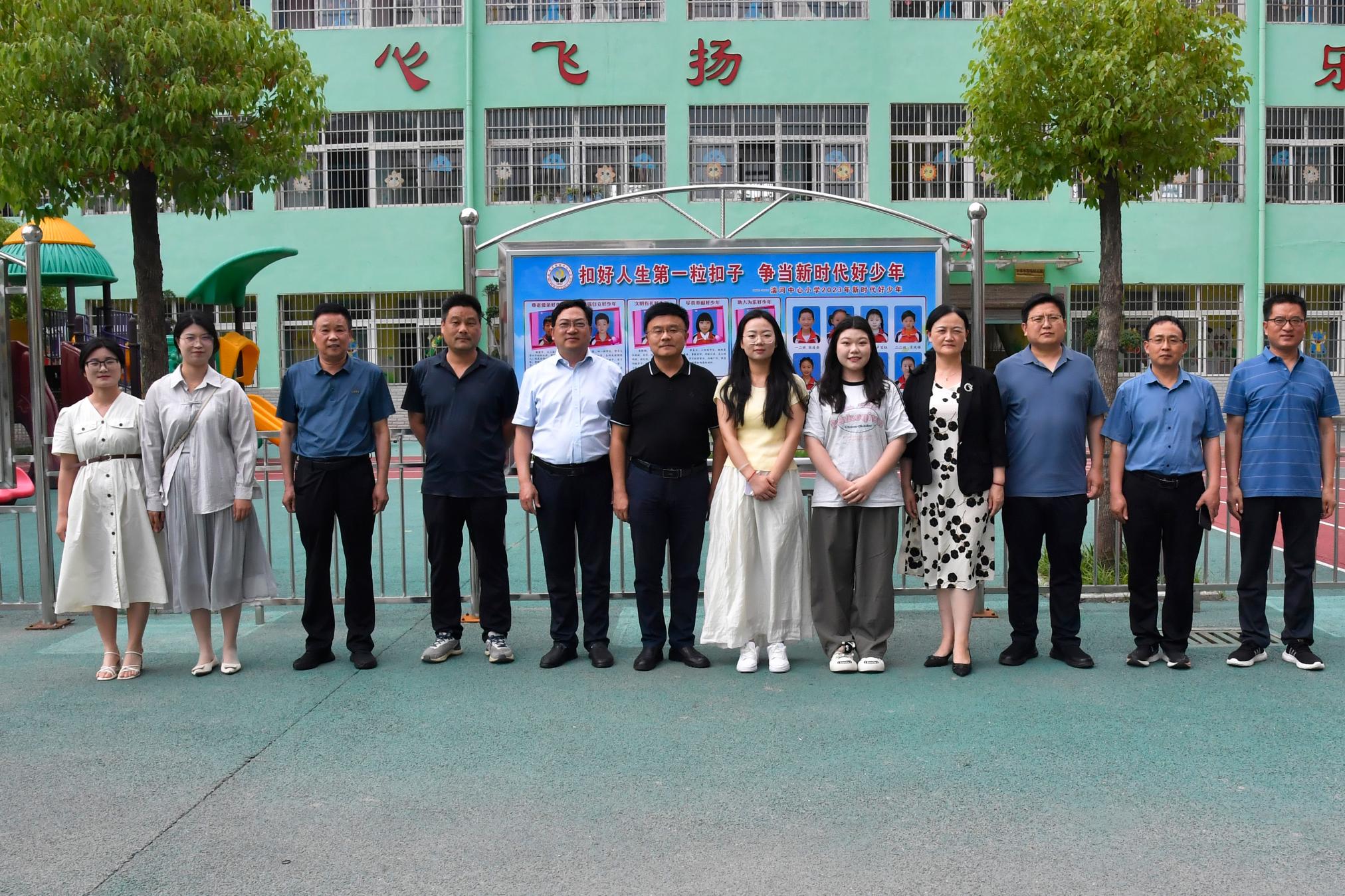 本网讯(姜莹月/文 冯一珺/图)5月30日,副校长刘红林带领党委宣传部、美术与艺术设计学院相关负责同志一行,到邓州市穰东实验学校、湍河中心小学、文渠镇实验小学、桑庄镇中心学校,看望慰问参加河南省“快乐成长”文艺助力新时代文明实践行动的5名志愿者。邓州市领导、市文联等相关单位负责同志陪同慰问。