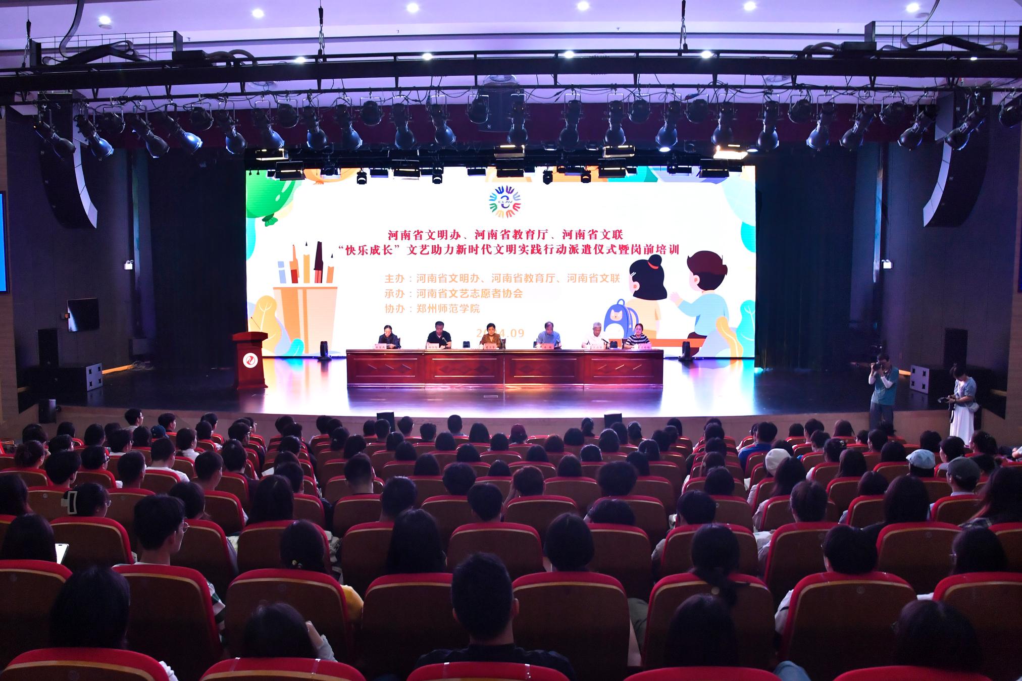 本网讯(关若村/文 冯一珺/图)9月11日上午,由河南省文明办、河南省教育厅、河南省文联主办的2024年下半年“快乐成长”文艺助力新时代文明实践行动派遣仪式暨岗前培训在郑州师范学院举行。新葡萄官网来自美术与艺术设计学院、音乐学院和体育学院的26名志愿者参加仪式,培训后他们将分别奔赴南阳市南召县、新野县、社旗县、西峡县的14所乡村学校,开展音乐、体育、美术、书法学科的为期3个月的文艺支教工作。
