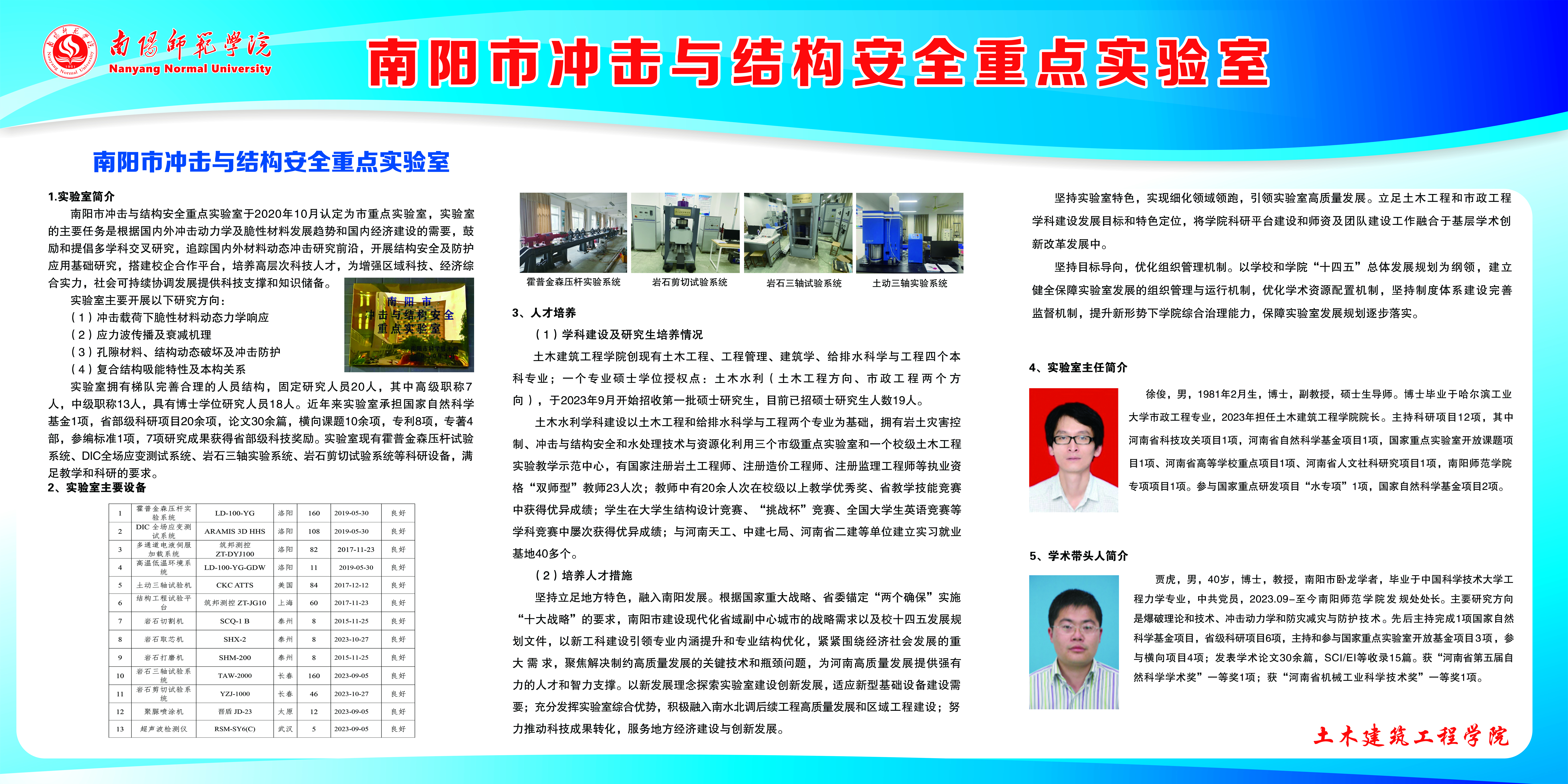学院现有建筑材料、建筑模型、水质检测、结构工程、建筑CAD、工程测量等12个教学实验室;BIM技术与工程、海绵城市和地下城市空间3个研究中心;岩土灾害控制、水处理与资源化利用、冲击与结构安全3个市重点实验室,其中,冲击与结构安全重点实验室获得2024年度南阳市市级重点实验室评估优秀档次。仪器设备资产总值4000余万元,实验室建筑面积5500平方米,为实验课程教学和科研提供了有力保障。