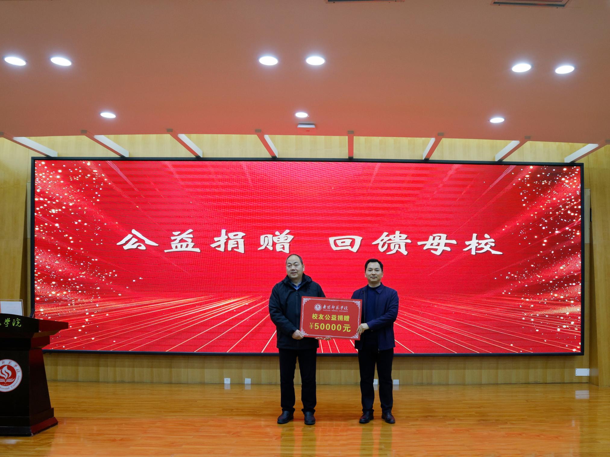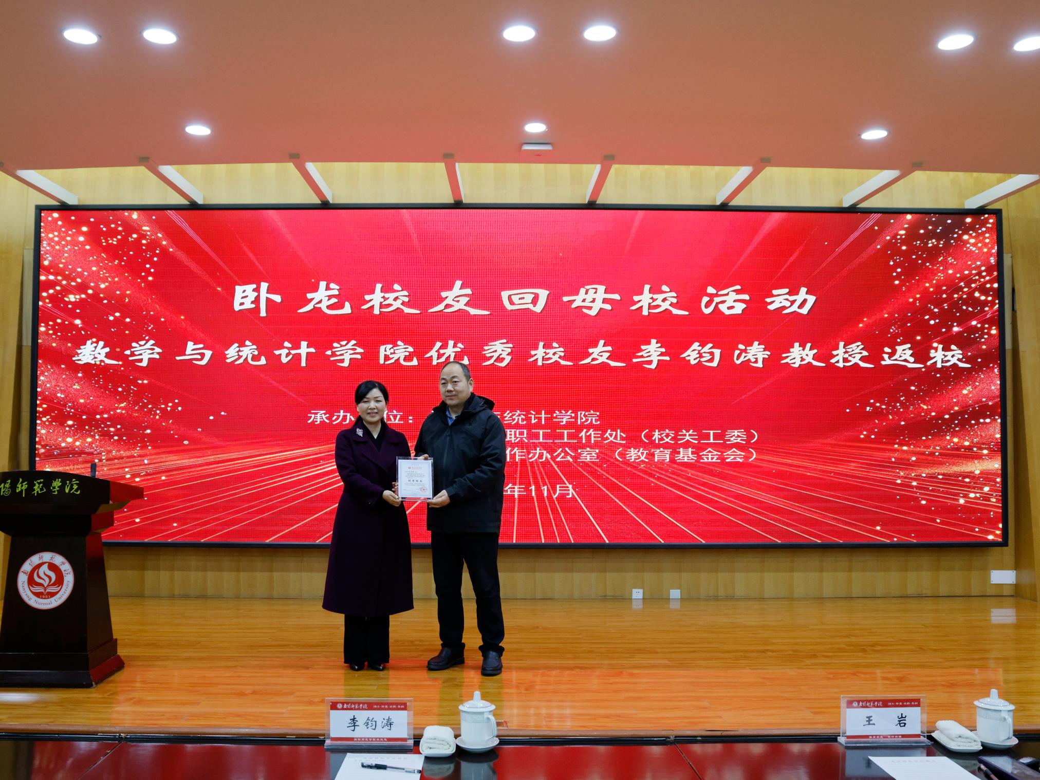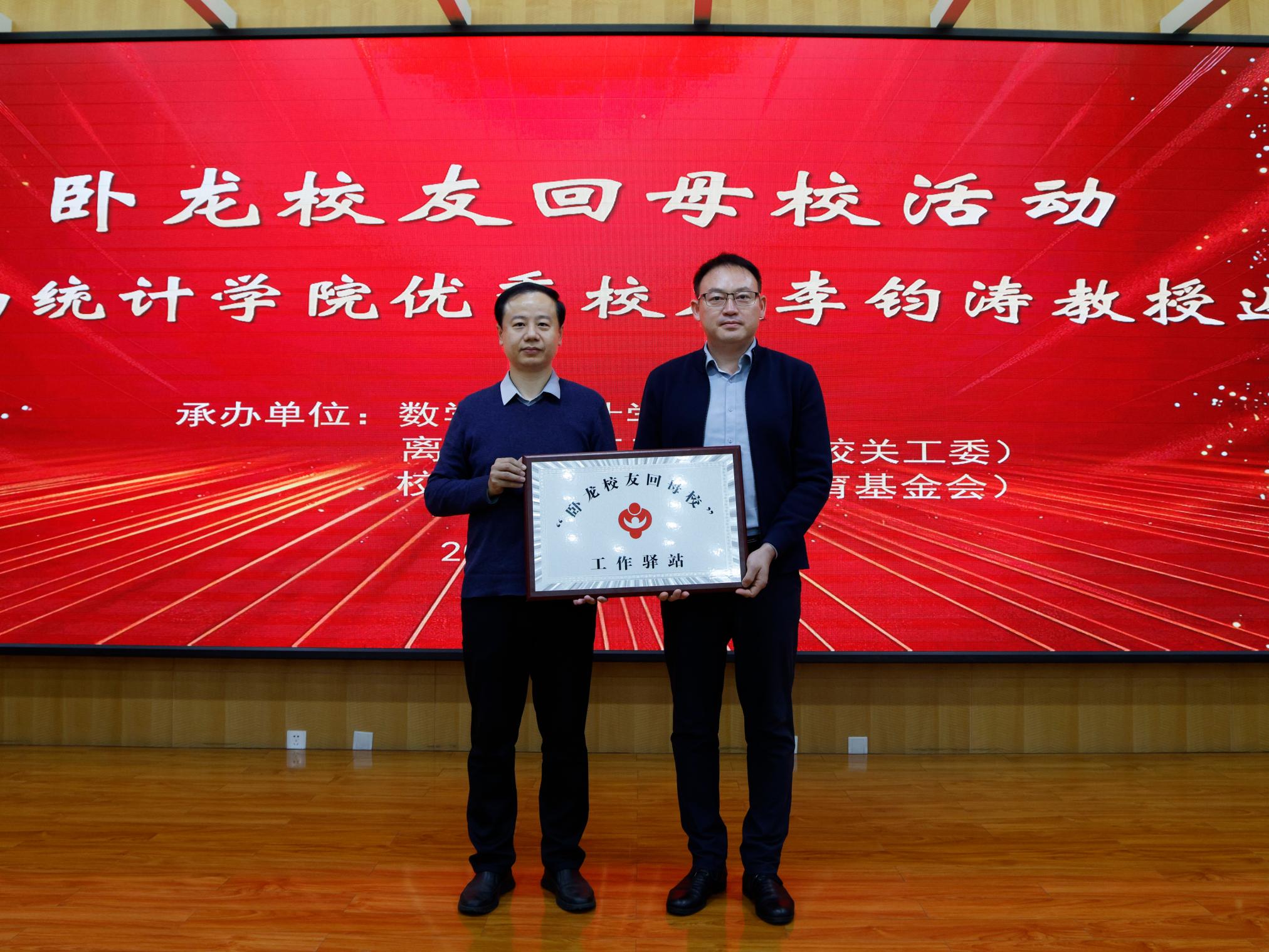 数学与统计学院党委书记冷元峰代表学院接受李钧涛教授的第二轮公益奖学金捐赠,并为李钧涛教授颁授捐赠证书;学校关工委进行了“卧龙校友回母校工作驿站”授牌。