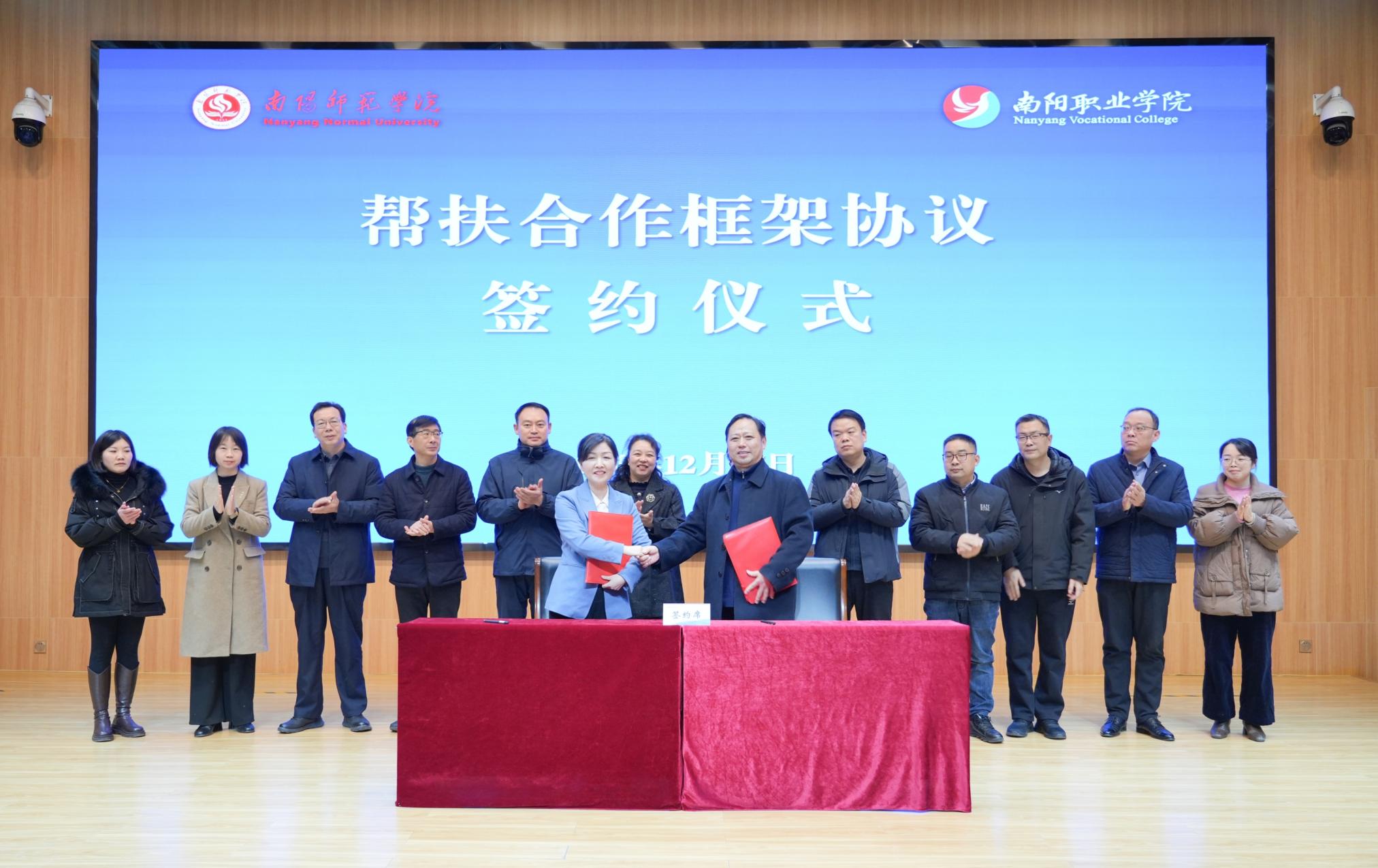 本网讯(通讯员 王典)12月27日,新葡萄官网与南阳职业学院帮扶合作框架协议签约暨“南水北调中线工程水源地数字经济研究院和协同创新中心”授牌仪式在南阳职业学院举行。副校长王岩、南阳职业学院校长郭建生,新葡萄官网国内合作处、校友工作办公室、创新创业学院、经济与管理学院、南水北调中线水源区水安全协同创新中心等单位负责同志参加。活动由南阳职业学院党委副书记任志强主持。