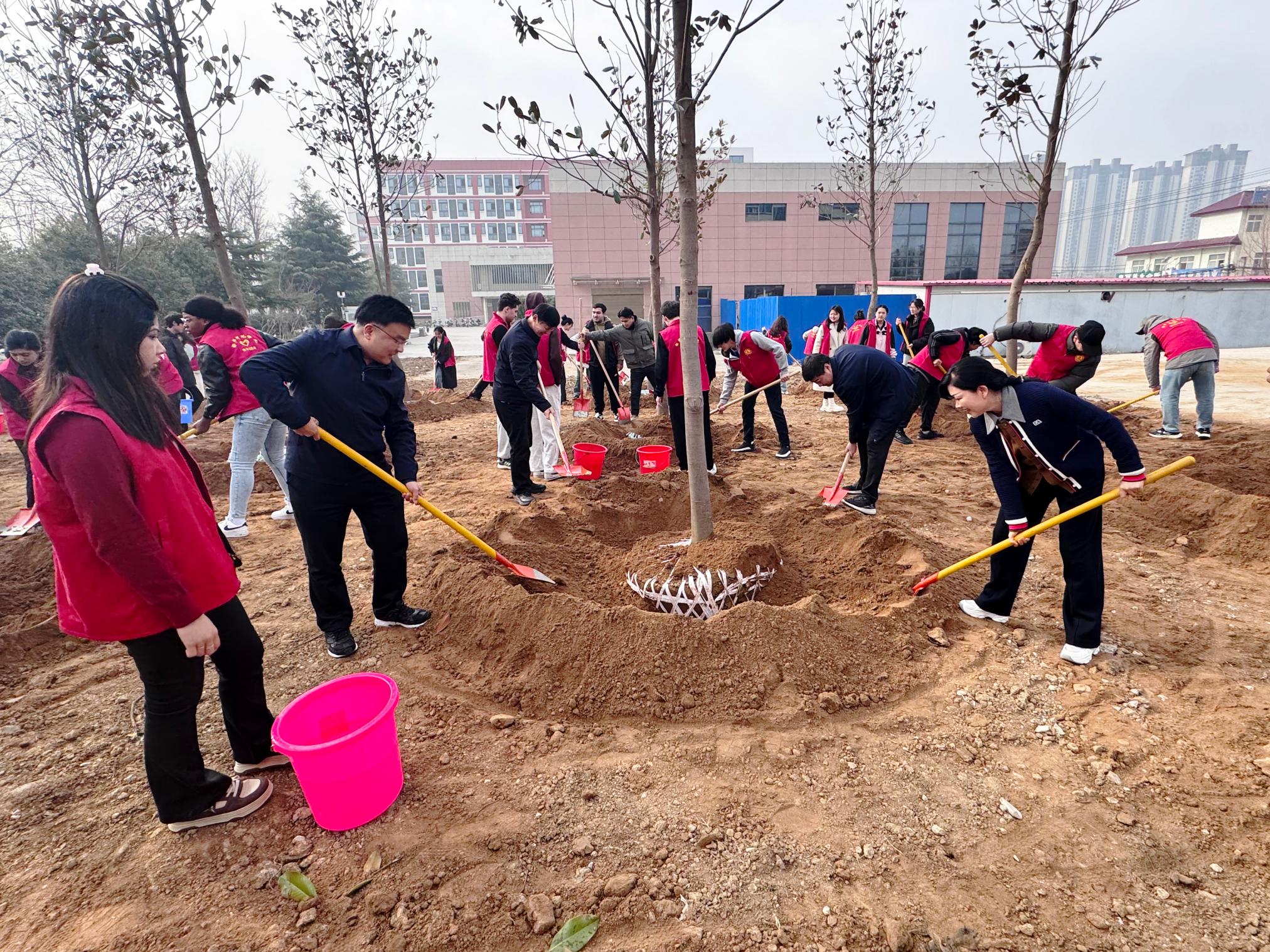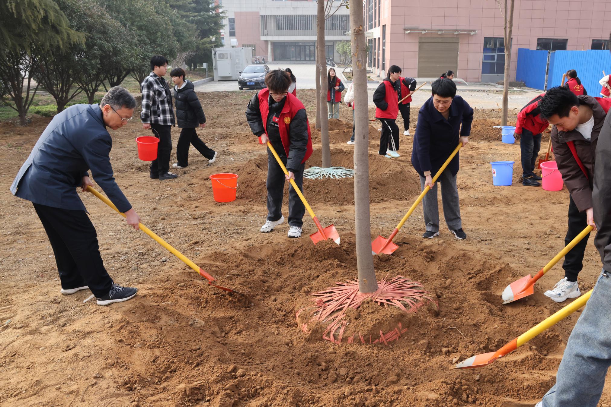 植树现场呈现出一片热火朝天的劳动景象,校领导和志愿者们一起挥锨、培土、扶正、踩实、围堰、浇水,大家分工协作,相互配合,将20余棵广玉兰栽下。新栽种的树苗整齐有致,迎风挺立,在春风的吹拂下焕发出勃勃生机。