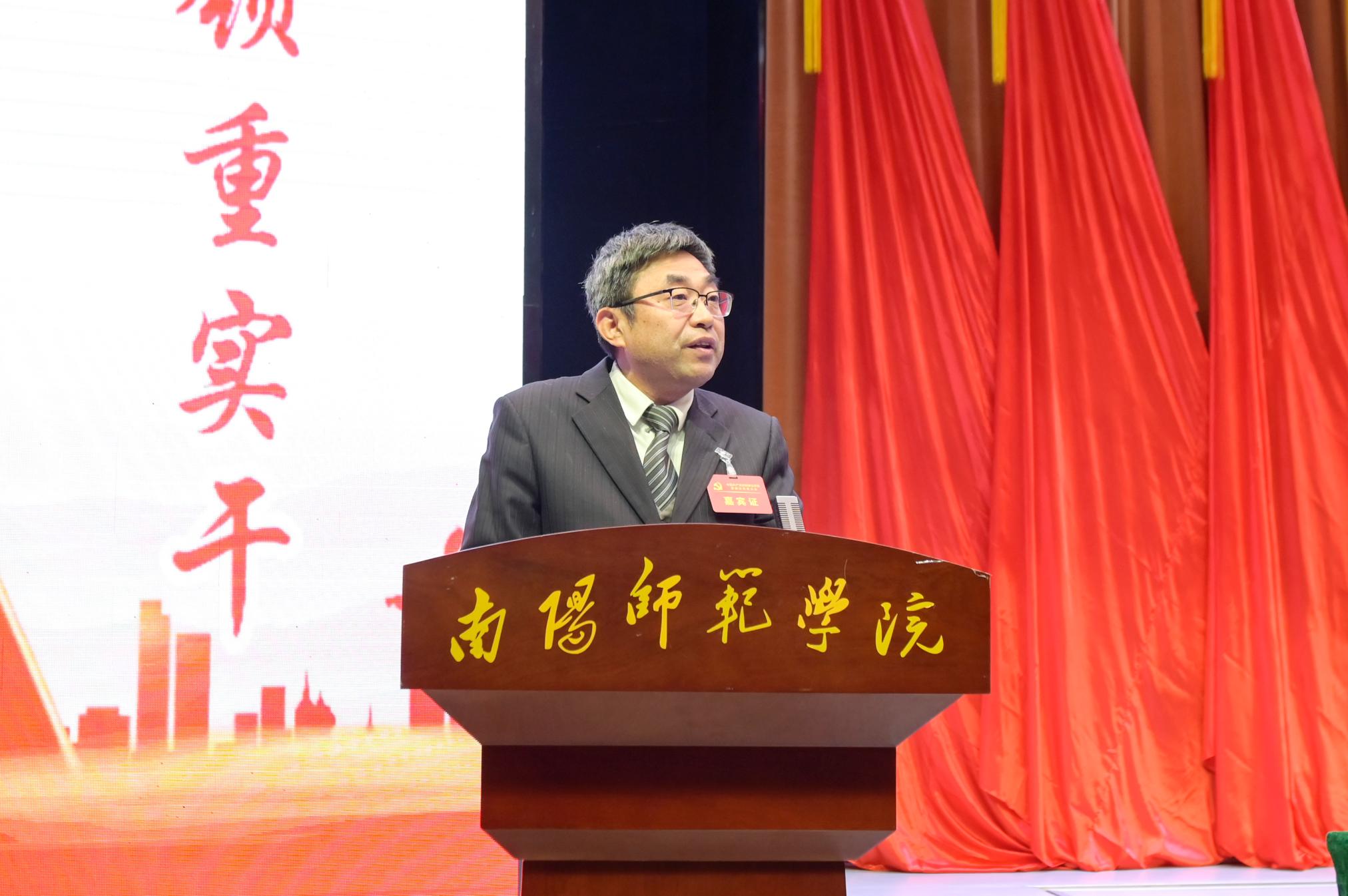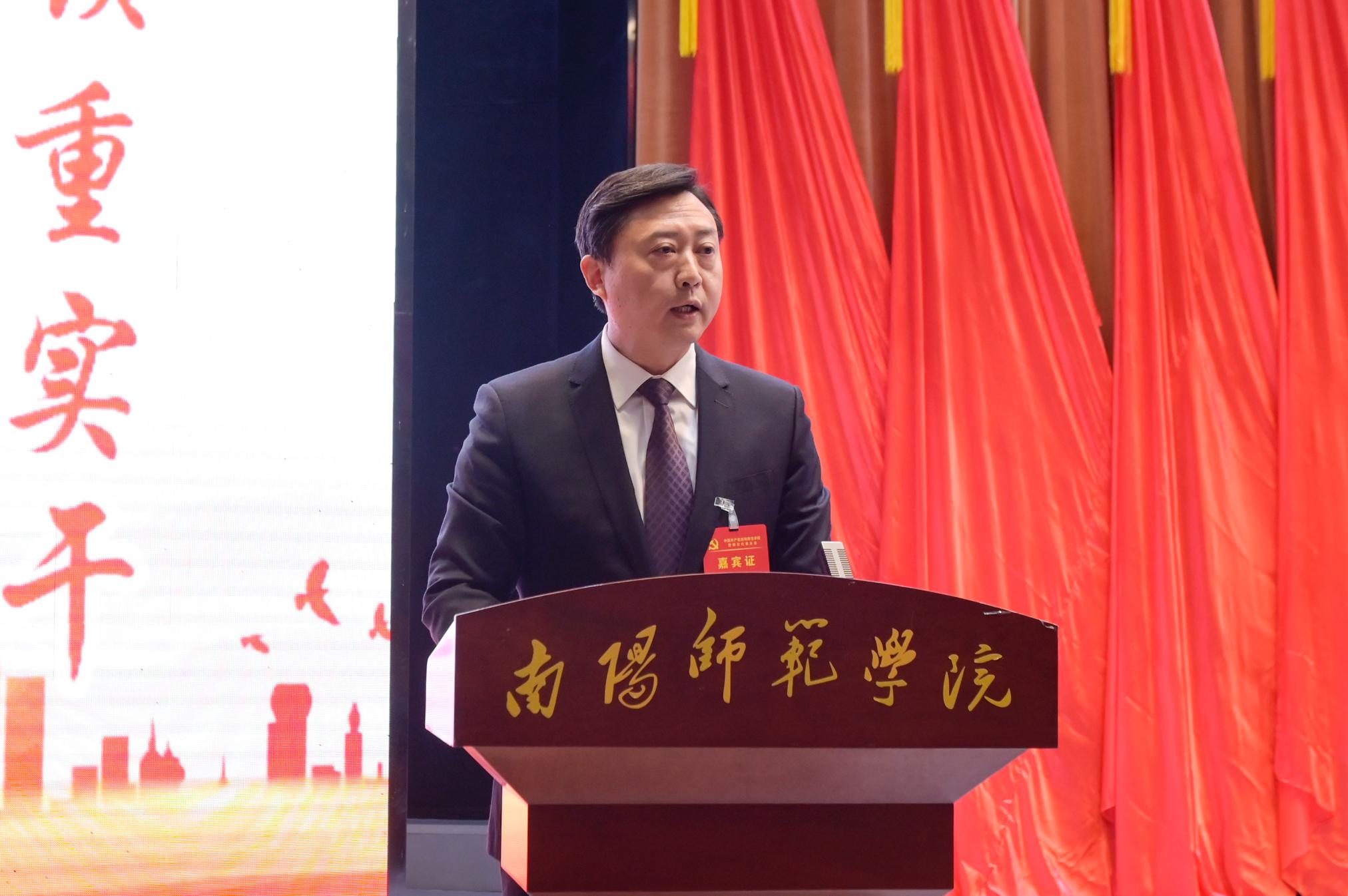 张国强代表省委教育工委、省教育厅党组向大会的召开表示祝贺。他指出,第三次党代会以来,新葡萄8883官网AMG坚持以习近平新时代中国特色社会主义思想为指导,全面贯彻党的教育方针,在学科建设、人才培养、科技创新、社会服务等方面取得了许多历史性进步和标志性成果,成功探索出了一条地方师范院校以自身高质量发展振兴教师教育,服务国家战略和区域经济社会的办学道路,为加快教育强省建设、助力谱写中国现代化河南篇章提供了有力支撑。他对即将产生的新一届党委提出五点希望:一是发挥党建引领作用,坚持和加强党对学校的全面领导;二是落实立德树人根本任务,持续提升人才培养质量;三是发挥专业学科优势,全面服务经济社会发展;四是统筹发展和安全,坚决筑牢校园安全稳定防线;五是纵深推进全面从严治党,营造风清气正干事创业良好环境。