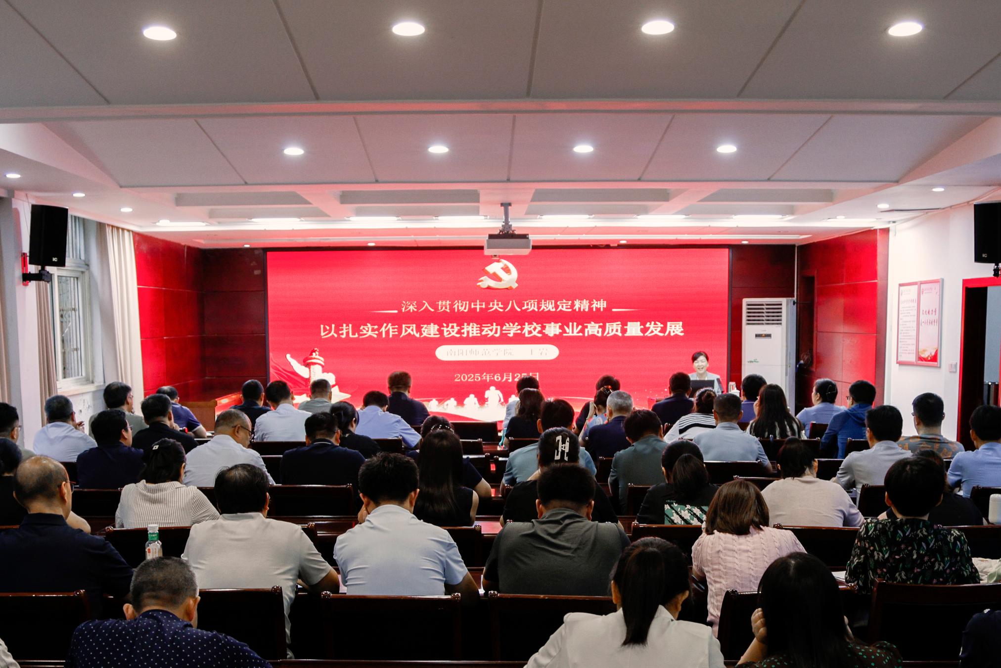 本网讯(王典/文 张琳瑶/图)为强化党员干部作风建设,深入贯彻中央八项规定精神学习教育,6月25日下午,副校长王岩以“深入贯彻中央八项规定精神,以扎实作风建设推动学校事业高质量发展”为题,在办公大楼一楼东会议室讲授专题党课。相关职能部门和学院参加学习。