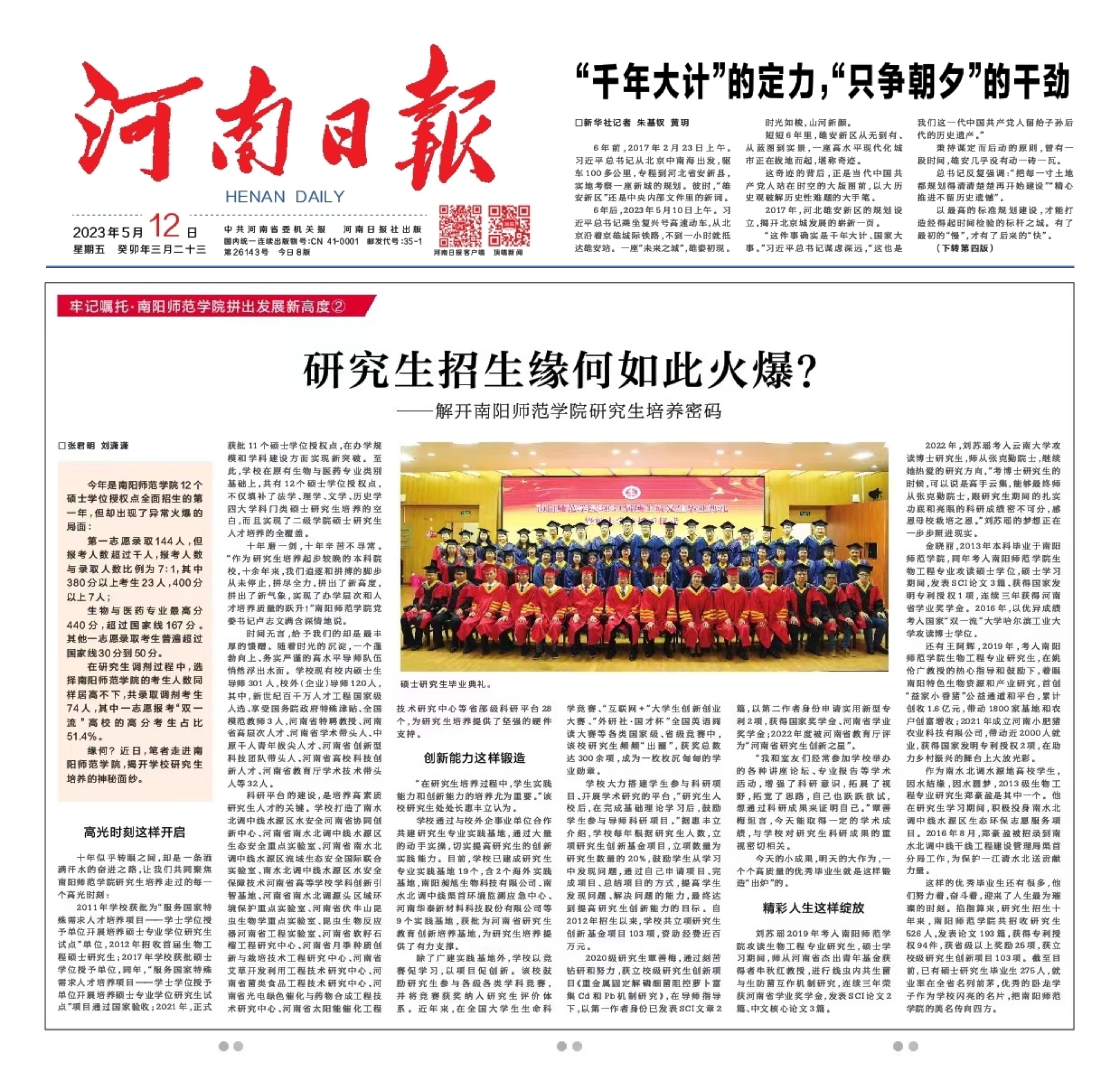 2023年5月12日,《河南日报》“牢记嘱托·新葡萄8883官网AMG拼出发展新高度”栏目刊发新葡萄8883官网AMG系列文章②《研究生招生缘何如此火爆?——解开新葡萄8883官网AMG研究生培养密码》,现全文转载如下: