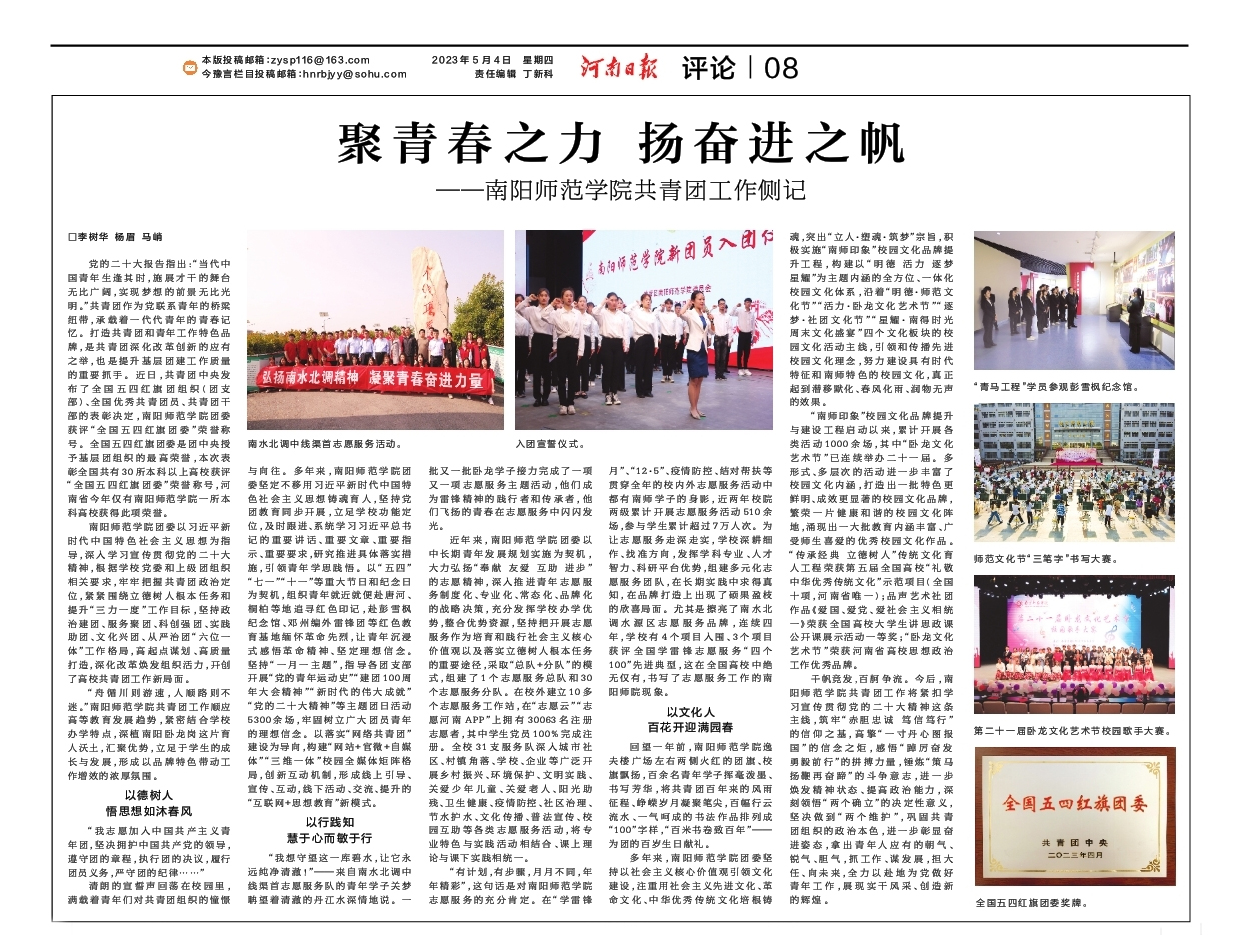 2023年5月4日,《河南日报》刊发《聚青春之力 扬奋进之帆——新葡萄8883官网AMG共青团工作侧记》,现全文转载如下: