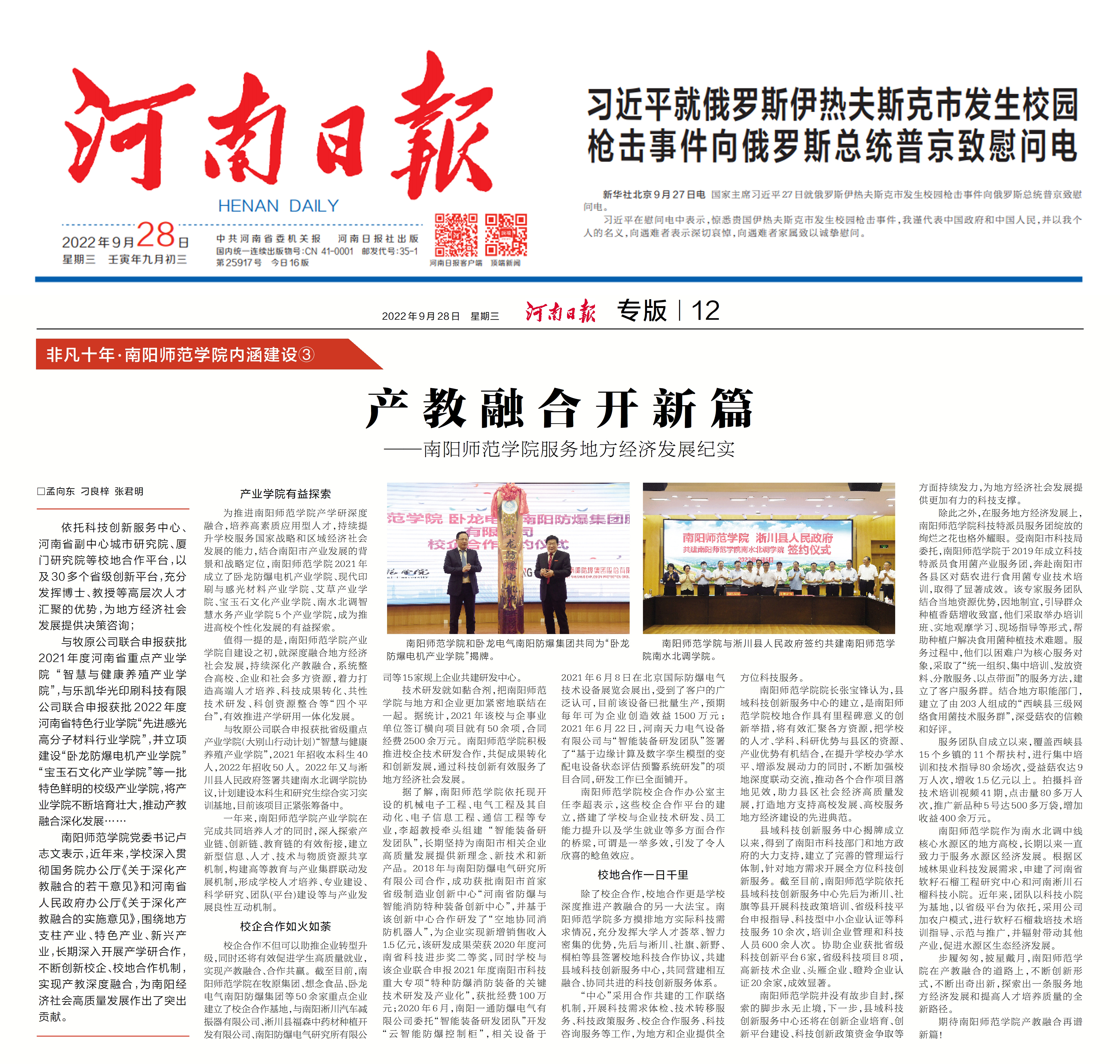 2022年9月28日,《河南日报》“非凡十年·新葡萄8883官网AMG内涵建设”栏目刊发新葡萄8883官网AMG系列文章③《产教融合开新篇——新葡萄8883官网AMG服务地方经济发展纪实》,现全文转载如下: