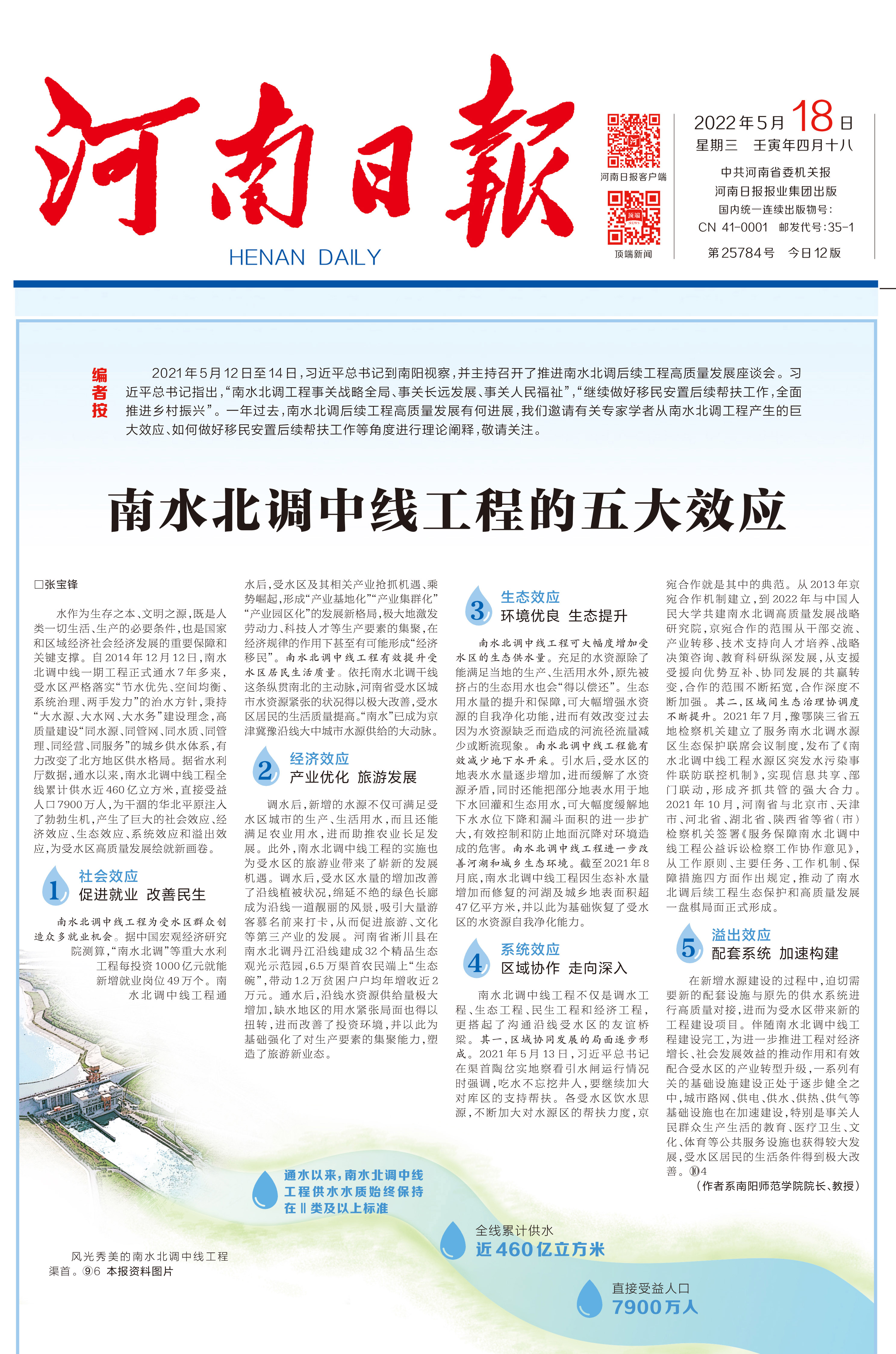 2022年5月18日,《河南日报》刊发新葡萄8883官网AMG校长张宝锋的文章《南水北调中线工程的五大效应》,现全文转载如下: